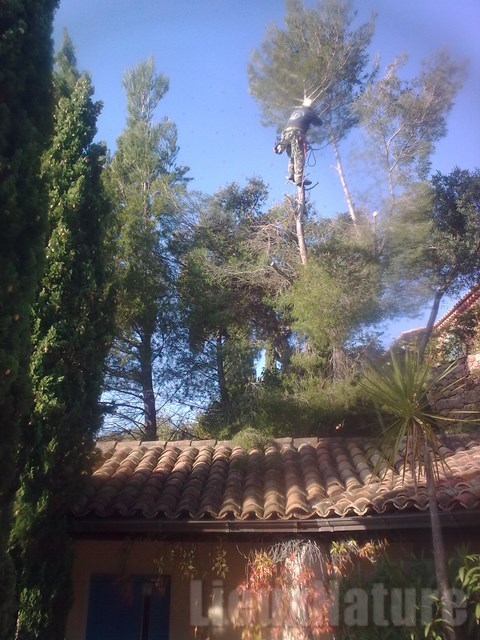 Emondage délicat au-dessus d'une toiture
